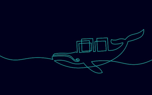 一行魚和容器電腦碼頭開發者應用程式概念. 草圖繪製開源程式. 數據編碼向量線圖